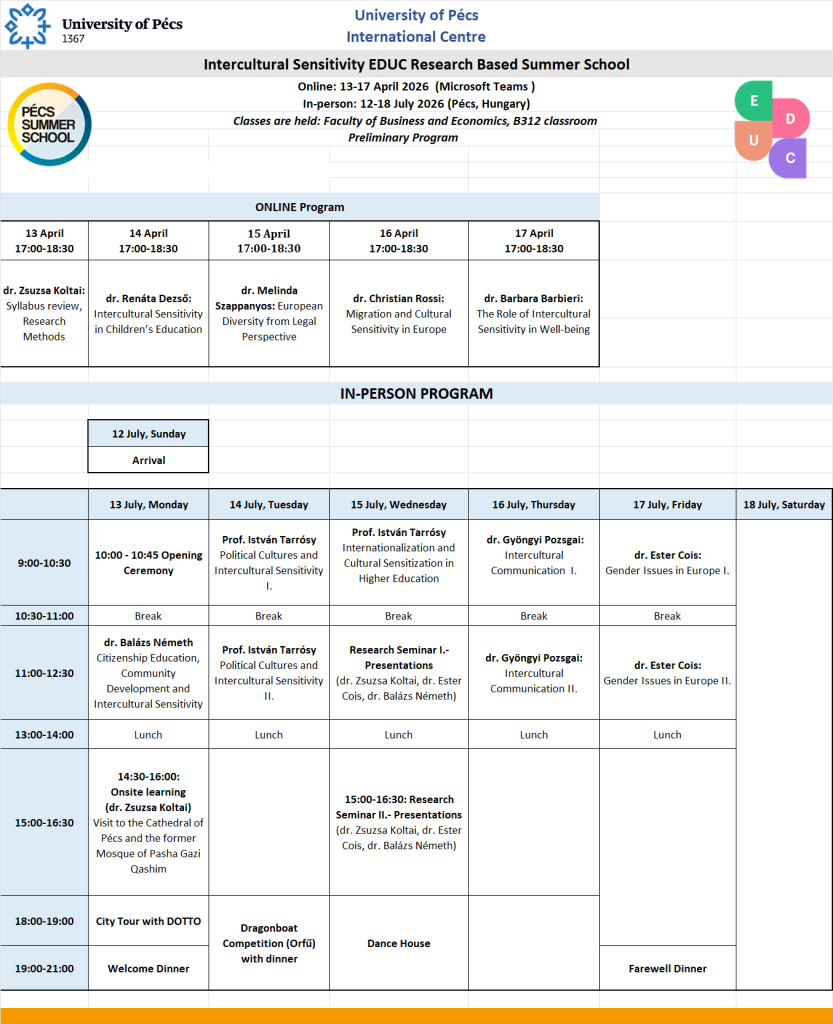 Unlock the power of cultural understanding at the Intercultural Sensitivity research-based summer school at the University of Pécs! Dive into fascinating research on identity, culture, and globalization while collaborating with peers from diverse backgrounds. Enhance your cultural awareness, improve your intercultural communication skills, and gain valuable insights into European cultural diversity. This unique experience will help you build essential skills for successful intercultural cooperation—skills you can apply in your future career. Apply now to expand your horizons and become a global citizen!